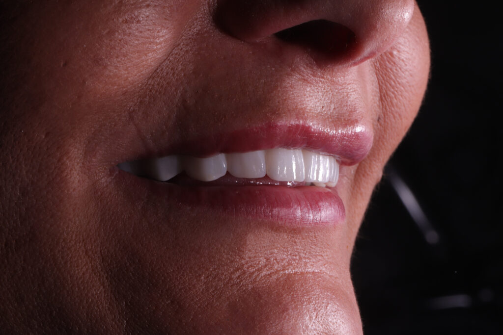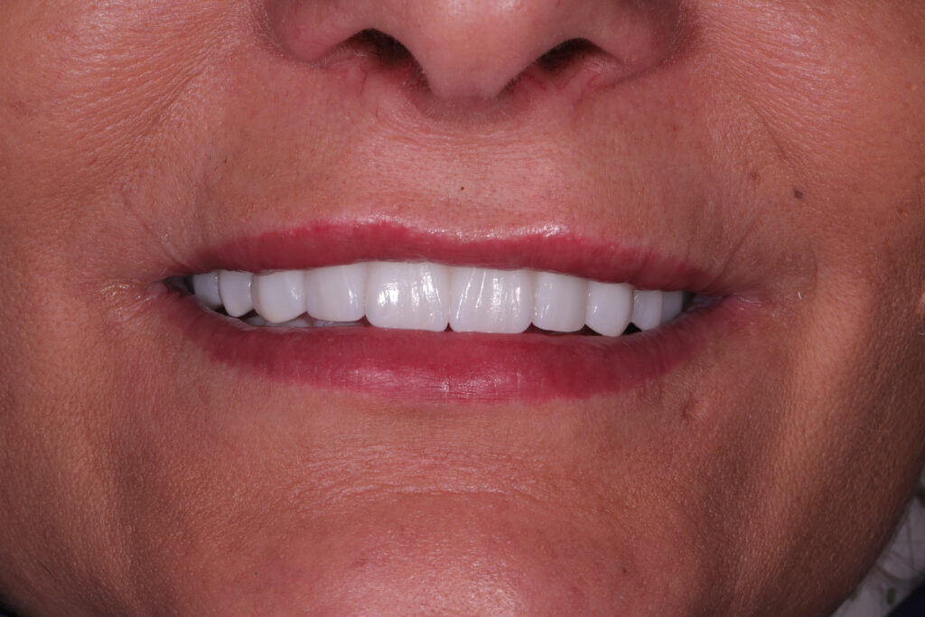 Po 6 miesiącach leczenie zakończyło się zamontowaniem ostatecznego mostu cyrkonowego, zaprojektowanego przez dr Natalię Matel we współpracy z laboratorium protetycznym Perfect Lab.